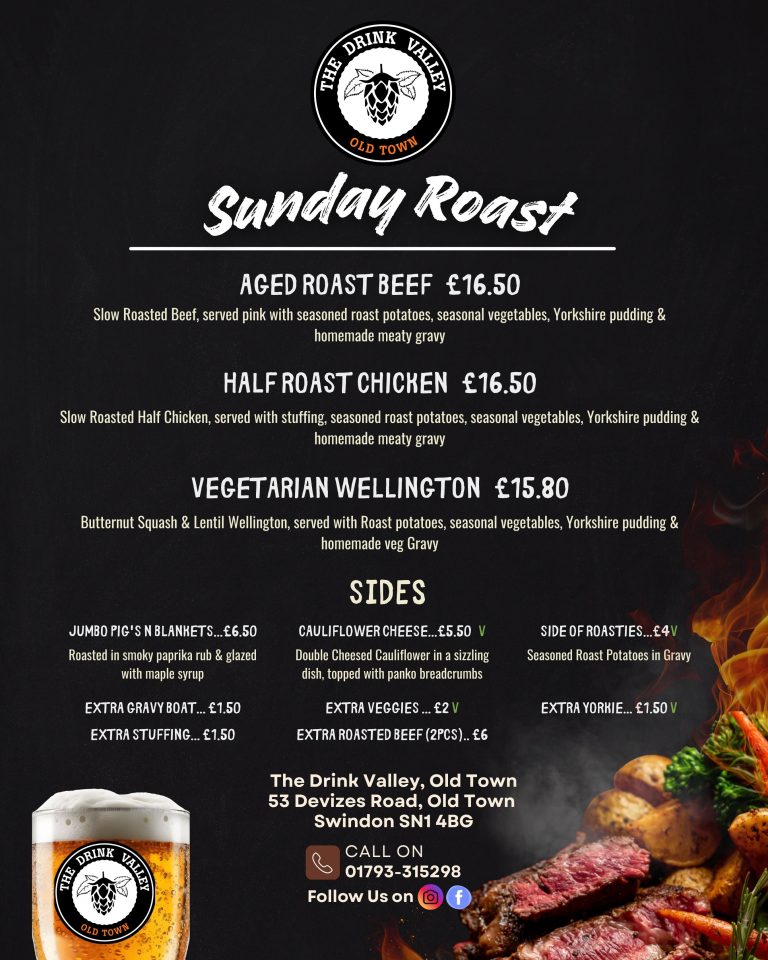 THE DRINK VALLEY, OLD TOWN “Traditional English Food and Fine Craft Ale in the beating heart of Swindon OLD TOWN” DEALS & EVENTS CHRISTMAS BOOKING BOOK TABLE PRIVATE HIRE BEER MENU FOOD MENU Click here for full view MOST POPULAR Sunday Roast A proper Sunday roast in a pub isn’t just a meal; it’s a tradition… Come and join us every Sunday… BOOK TABLE CONTACT US OLDTOWN@THEDRINKVALLEY.COM 01793 315298, 07780440349 Don't Miss Book Table Book on our widget! DEALS & EVENTS The Drink Valley Old Town ,53 devizes road, Swindon SN1 4BG Old Town Location The Drink ValleyOld Town Day Bar Kitchen Sunday 12pm – 9pm 12pm – 5pm Monday Closed Closed Tuesday 4pm – 10pm 4pm – 9:30pm Wednesday 4pm – 10pm 4pm – 9:30pm Thursday 4pm – 10pm 4pm – 9:30pm Friday 12pm – 11pm 12pm – 9:30pm Saturday 12pm – 11pm 12pm – 9:30pm