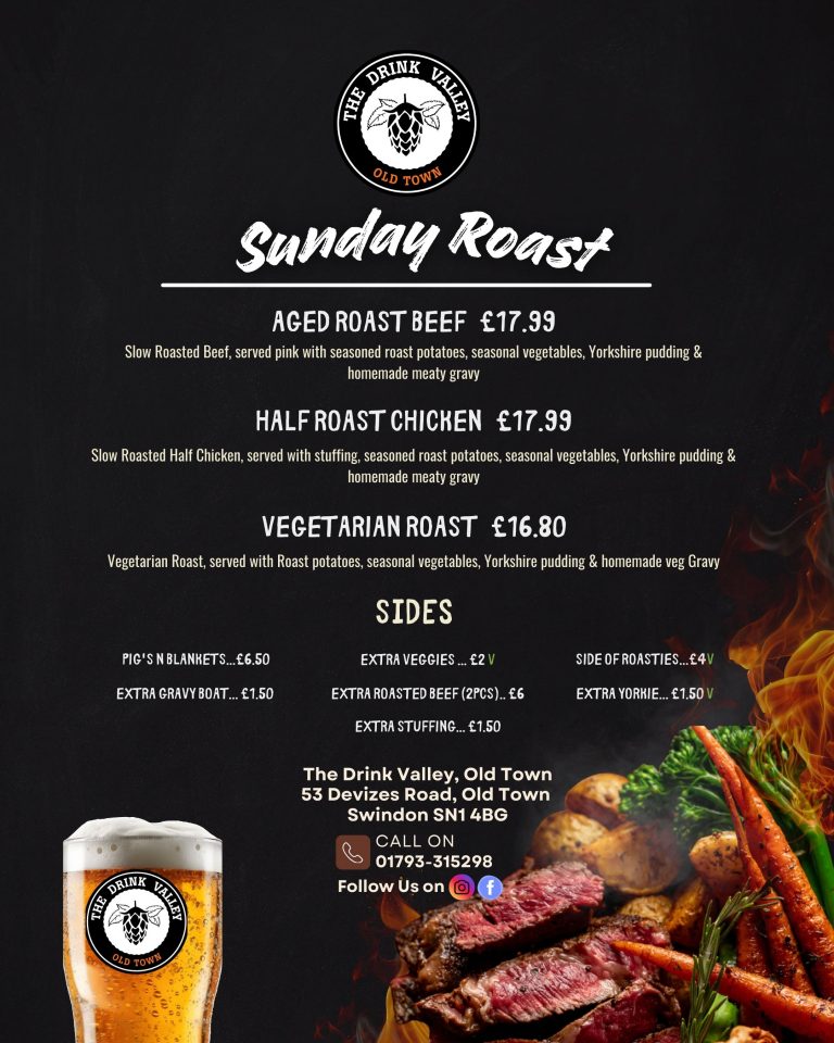 THE DRINK VALLEY, OLD TOWN “Traditional English Food and Fine Craft Ale in the beating heart of Swindon OLD TOWN” DEALS & EVENTS BOOK TABLE PRIVATE HIRE BEER MENU  FOOD MENU Click here for full view MOST POPULAR Sunday Roast A proper Sunday roast in a pub isn’t just a meal; it’s a tradition… Come and join us every Sunday… BOOK TABLE CONTACT US OLDTOWN@THEDRINKVALLEY.COM 01793 315298, 07780440349 Don't Miss Book Table Book on our widget! DEALS & EVENTS The Drink Valley Old Town ,53 devizes road, Swindon SN1 4BG Old Town Location The Drink ValleyOld Town Day Bar Kitchen Monday Closed Closed Tuesday 4pm – 10pm Closed Wednesday 4pm – 10pm 4pm – 9.30pm Thursday 4pm – 10pm 4pm – 9.30pm Friday 12pm – 11pm 12pm – 9.30pm Saturday 12pm – 11pm 12pm – 9.30pm Sunday 12pm – 9pm 12pm – 6pm